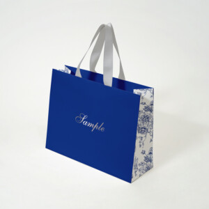 伝統を感させるロイヤルブルーと花柄の気品あるデザインの紙袋 |