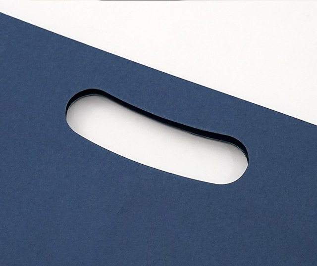 上部に穴をあけ紐を取り付けます。紙袋の正面に穴がなくなり紐の端も見えなくなるので、すっきりとした上品な紙袋になります。 ※ハトメと同時に選ぶことは出来ません。