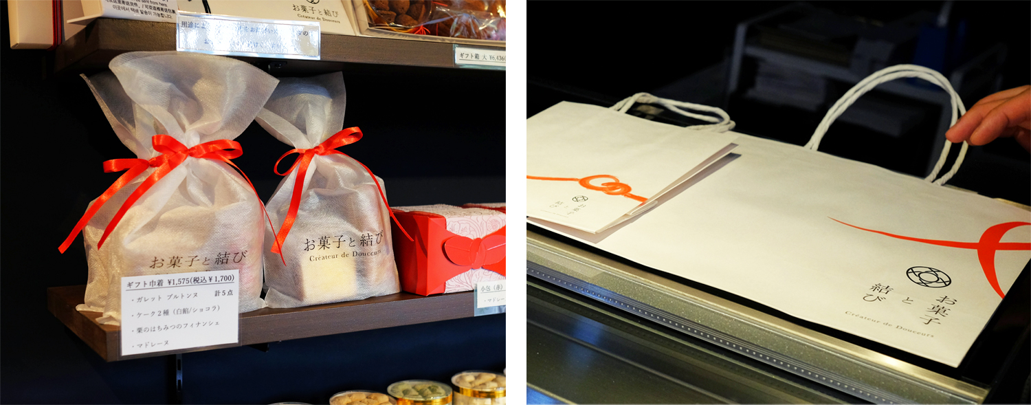 店名が「お菓子と結び」なのもありますが、大きな縁結びとなる結婚式の引き出物用のパッケージを作ってもいいかな、という考えもあります。引き出物ではなくても縁起が良いとか、縁結びになる、というイメージで、お客さまが面白がって使ってくださったら良いな、と考えています。