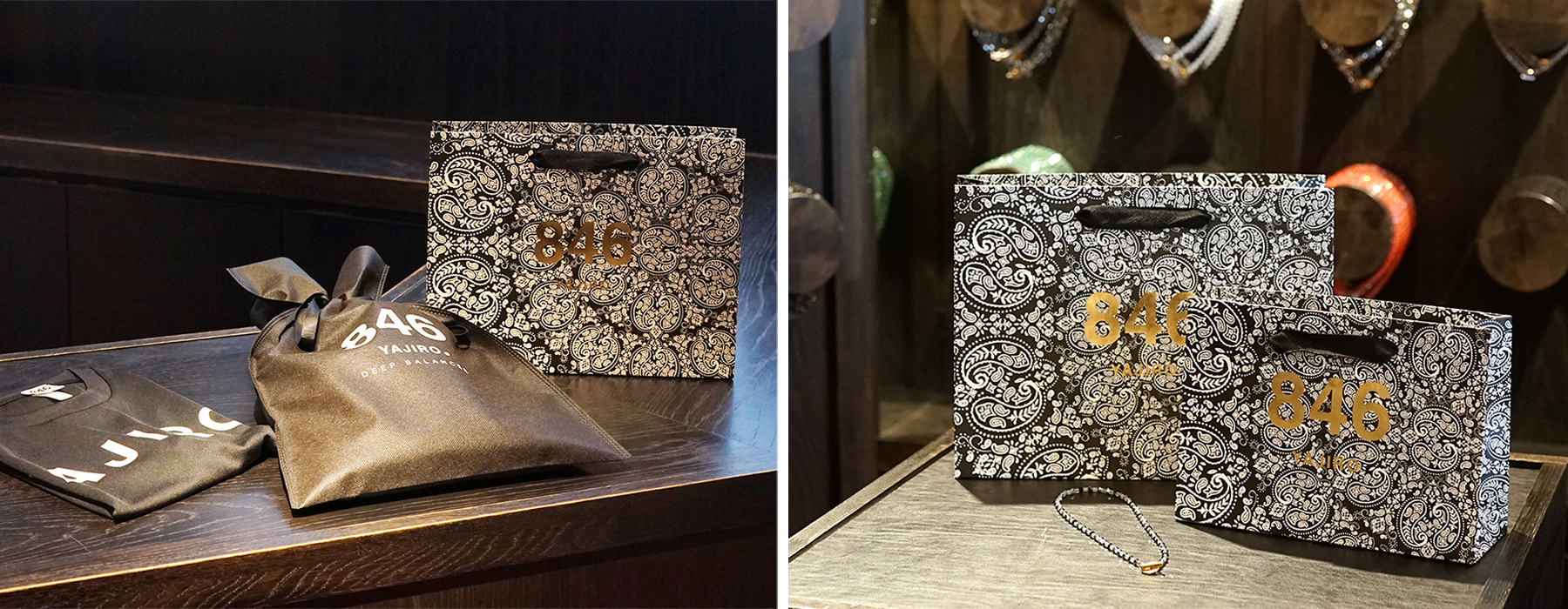 ショッパー4型を利用しています。オンラインショップで購入されたお客さまにもショッパーを同梱させていただいているのですが、デザインもオリジナルでとても評判が良いです。しかも、ペイズリー柄自体をよく見ると、小さく846YAJIROって書いてあるなど、846YAJIROの世界観を表現したデザインにこだわっています。現在は「846YAJIRO=ペイズリー柄」というイメージが定着しています。