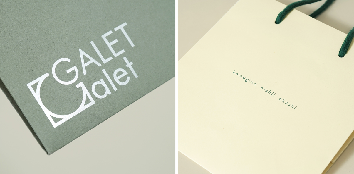 「Galet Galet(ガレ ガレ)」のショッパーは、ブランドのコンセプトカラーがグレーに決まっていたので、それにマッチした質感とカラーの紙素材を提案してもらい、その素材感や色に合わせたツヤなしシルバーの箔押しでロゴマークをプリントしました。