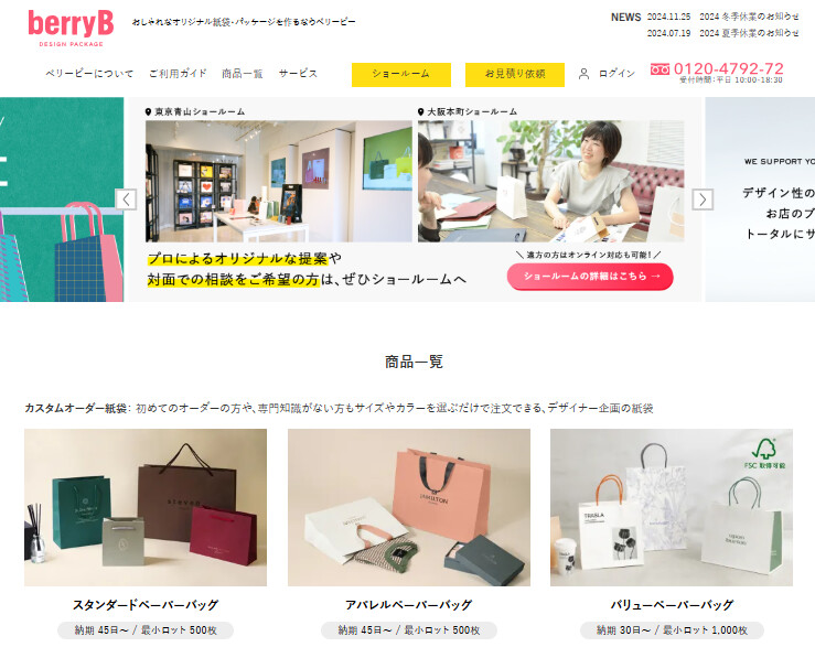 ベリービーは「日本中のパッケージをおしゃれにしたい」をコンセプトに、多種多様な業界のさまざまなお客様の紙袋を作成しています。そんなベリービーの特徴は以下のとおりです。