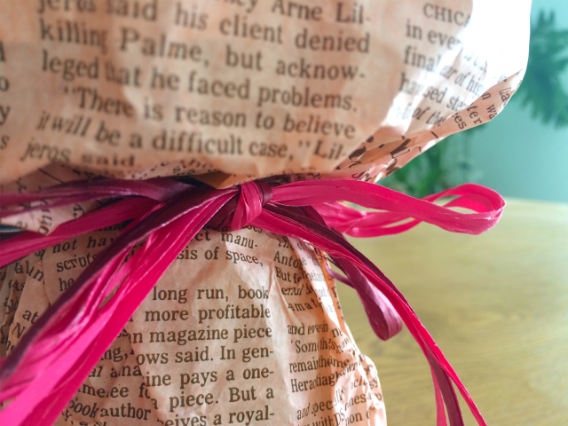 オーガンジーリボンで結んだらナチュラルな雰囲気になります。誰でも簡単に使用できて、おしゃれに仕上がる英字新聞の包装紙はおすすめです。