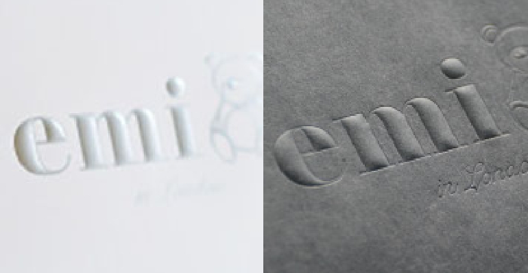 - インパクトのあるロゴへと変化する盛り上げ加工の「浮き出し箔押し」。色を付けずに紙の質感のままロゴを盛り上げるエレガントな仕上がりの「浮き出し空押し」も人気の加工です。