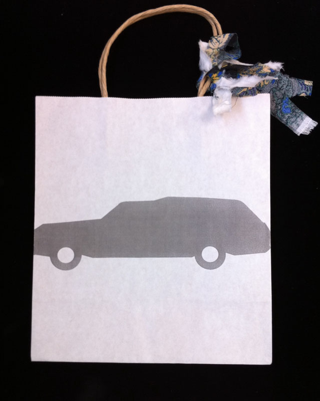 大きな車のイラストと端布を利用したチャームが素敵な紙袋。