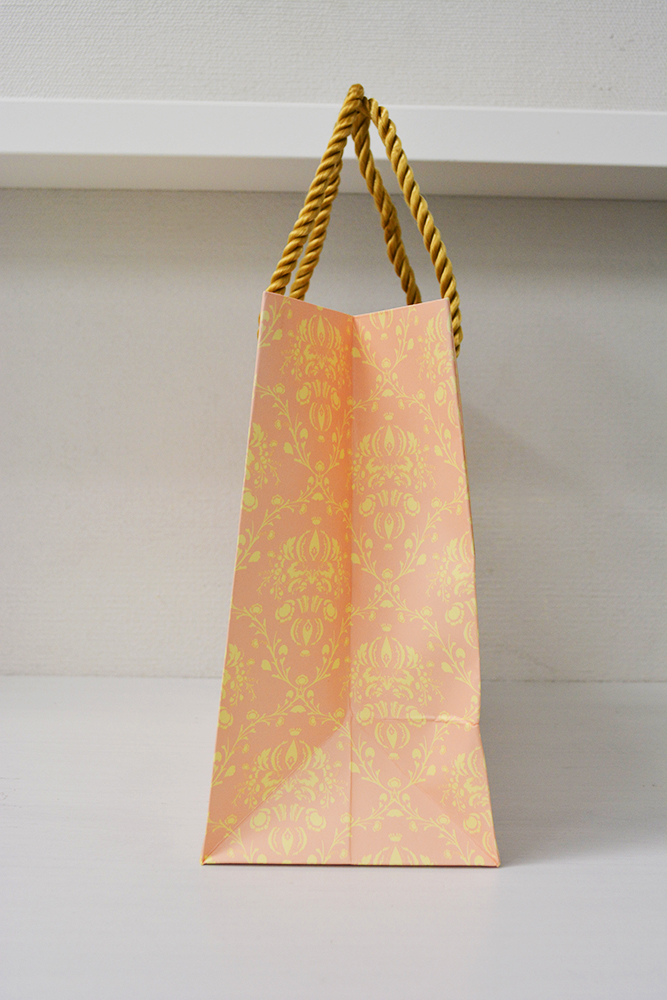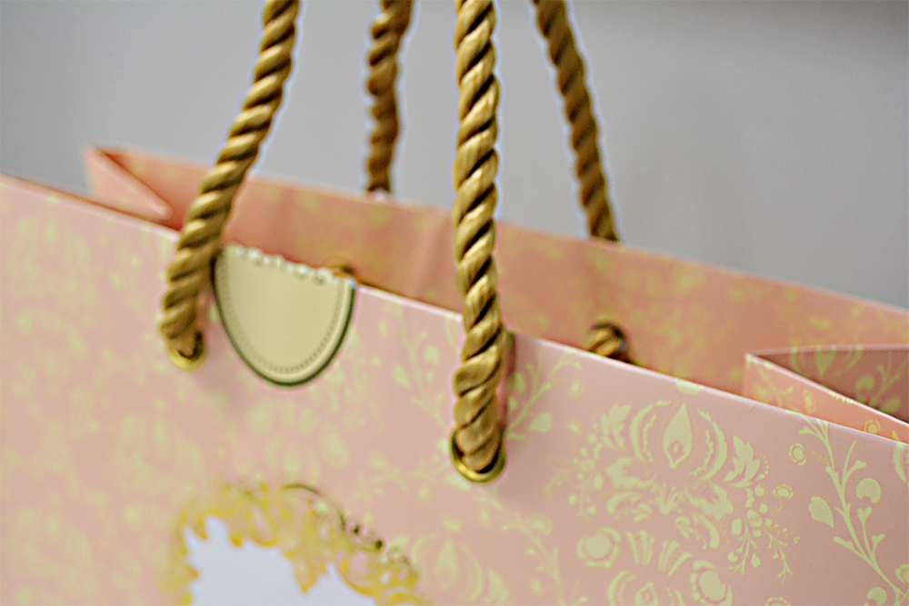 アンティークをおもわせるデザインの紙袋2014年05月08日 こんにちは。 ベリービーの芥川です。 今回紹介するのは、女の子の大好きなベビーピンクとゴールドを 組み合わせたかわいらしい紙袋です。 アンティークをおもわせるデザインと色合いで、幅広い年代の女性の目にとまりそうです。 ハンドルはゴールドのツイストロープで、ハトメも付いています。 オーナメントは艶ありの平泊で、ロゴ部分は浮きだしの箔押しで高級感があります。 キラキラとゴールドが光るので、とてもゴージャスです。 綺麗な女性がこの紙袋を持って歩いていたらつい目で追ってしまいそうですね。