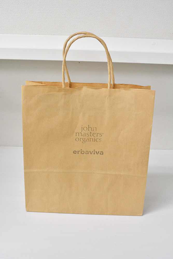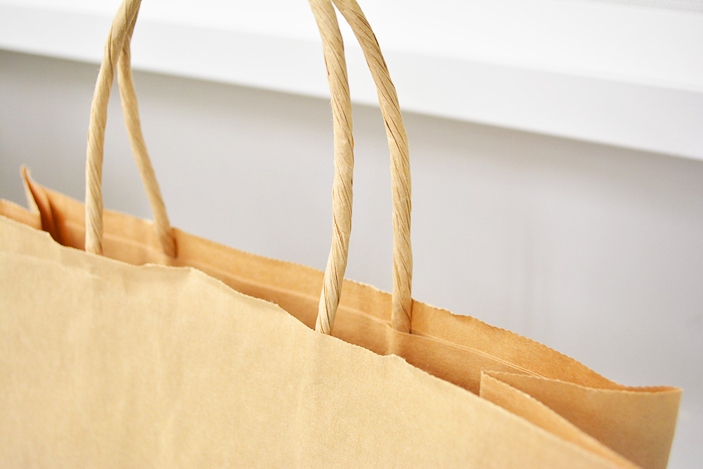 機械製袋で作られたクラフト紙の紙袋にロゴが印刷され、ハンドルは紙丸紐で、簡易な仕様になっています。