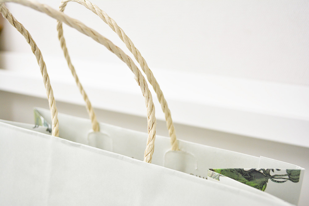 ハンドルは紙三本で、先ほどの紙丸紐とは少し違います。留め方はJカットと呼ばれる仕様で、スッキリとして見えます。