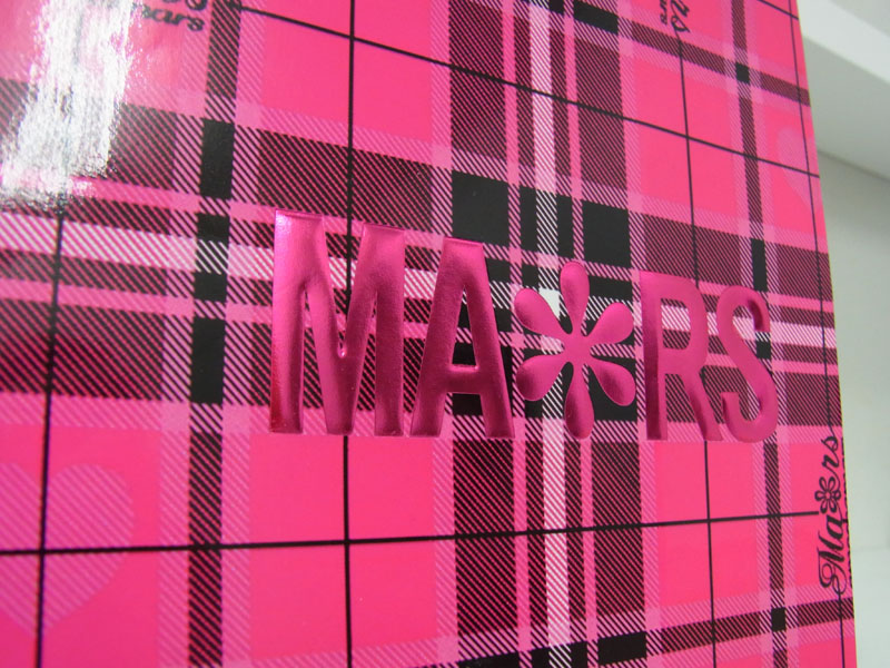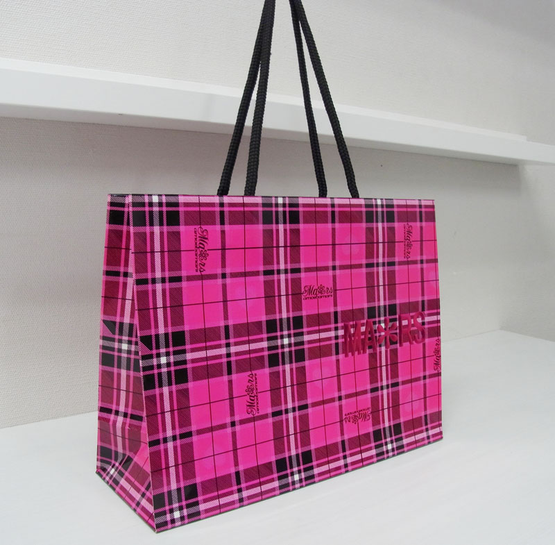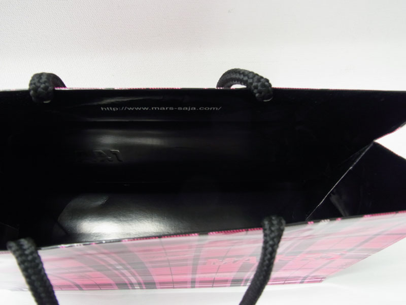 チェック柄の印刷がかわいいオリジナル紙袋2011年08月03日 こんにちはベリービーの芦谷です。 今日はチェック柄の印刷がとてもかわいいオリジナル紙袋をご紹介します。 以前、ヒョウ柄のショップバックをご紹介したのと同じ 109系のブランドの紙袋です。 このブランドはいっつもぷっくらした肉付け箔押しが特徴ですね。 そして、アパレルブランドではお約束のURLの印刷。 これは一般企業もまねればいいと私は思っています。 ネット時代、URLは大切ですね!! 内側の真っ黒い印刷と 表面のインパクトのあるピンク色とのコントラストが かっこいいですね!!