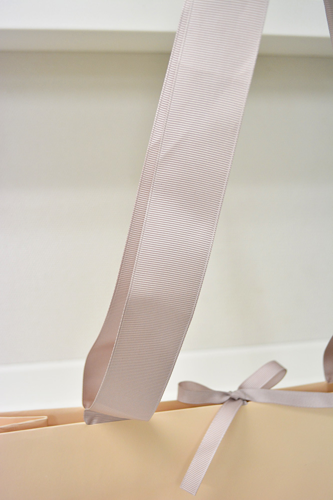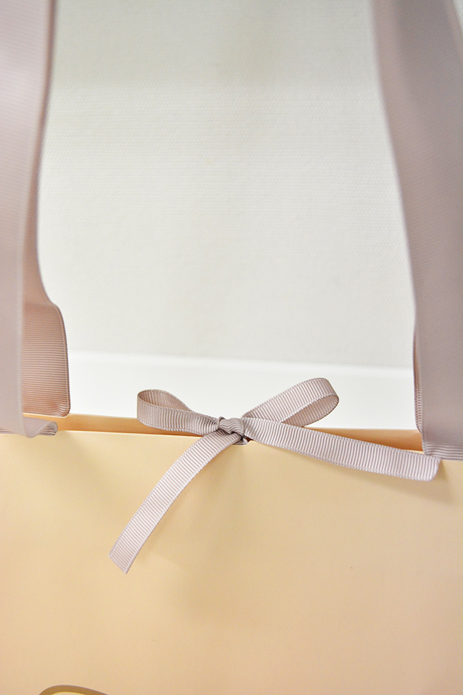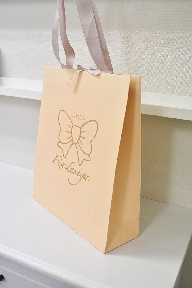 今日ご紹介するのは、ヌーディーな色とリボンが乙女心をくすぐるかわいい紙袋です。
