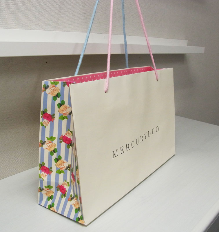 かわいいオリジナル紙袋2011年08月13日 こんにちはベリービーの芦谷です。 今日もお盆の真っ只中!! 本当に静かな一日です。 そんな静かな日にふさわしいかわいらしい紙袋をご紹介致します。 このブランドはいつも紙袋に力を入れていますね。 テーマによってデザインを見事に切り替えています。 今回のはラブリーなデザインです。 サイドの切り返しがとてもかわいらしくデザインされています。 口折りの部分のデザインや 手提げ紐の色を切り替える所なんかは 流石に紙袋を作り慣れた感じがしますね。