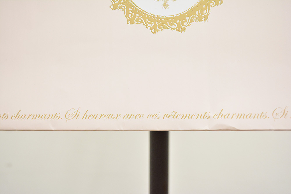 肩にかけれる程大きい紙袋で、一面淡いピンクでシンプルに真ん中にロゴが入っています。
