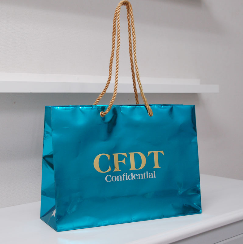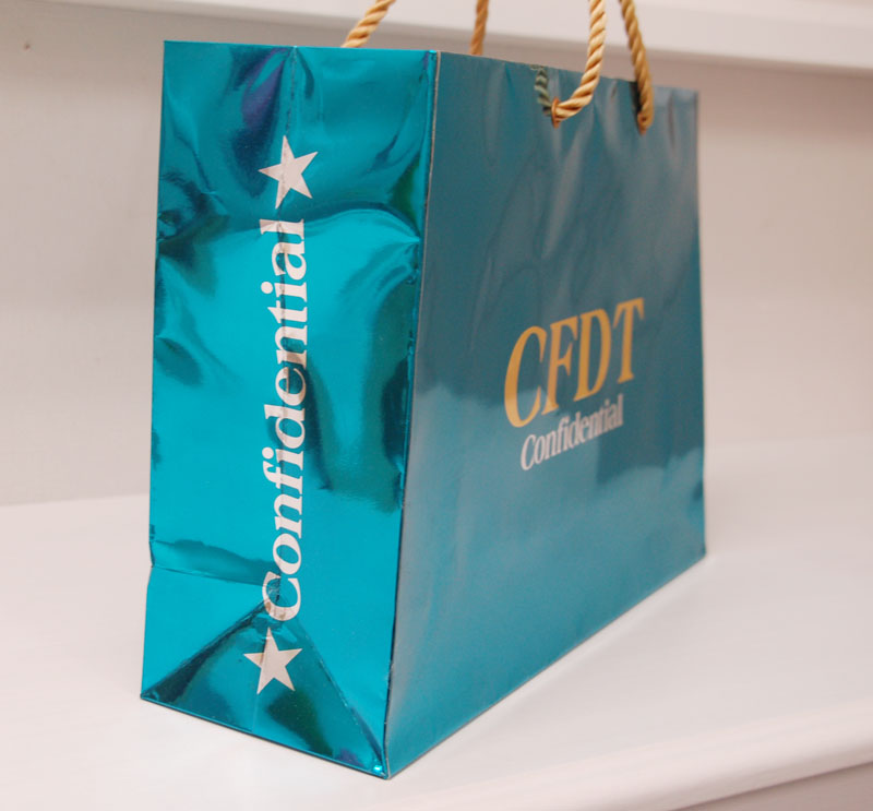 ピカピカのおしゃれ紙袋の印刷2011年08月31日 こんにちはベリービーの芦谷です。 日本列島に台風か迫っていますね… 早く帰らないと…と思いながら 今日も素敵な紙袋をご紹介させていただきます。 本日、ご紹介している袋はアルミ蒸着紙という紙に印刷された紙袋です。 ようするにアルミホイルの上に印刷しているような物です。 この紙袋の贅沢なところは これだけキラキラの素材を使用してるにもかかわらず、 ロゴの印刷にゴールドの箔押しを使用しているところです。 箔押しも浮きだし版を使用しているところが素敵です。 紐はおしゃれにツイストロープです。