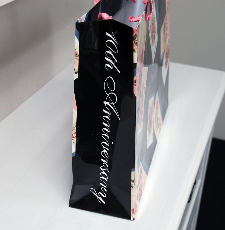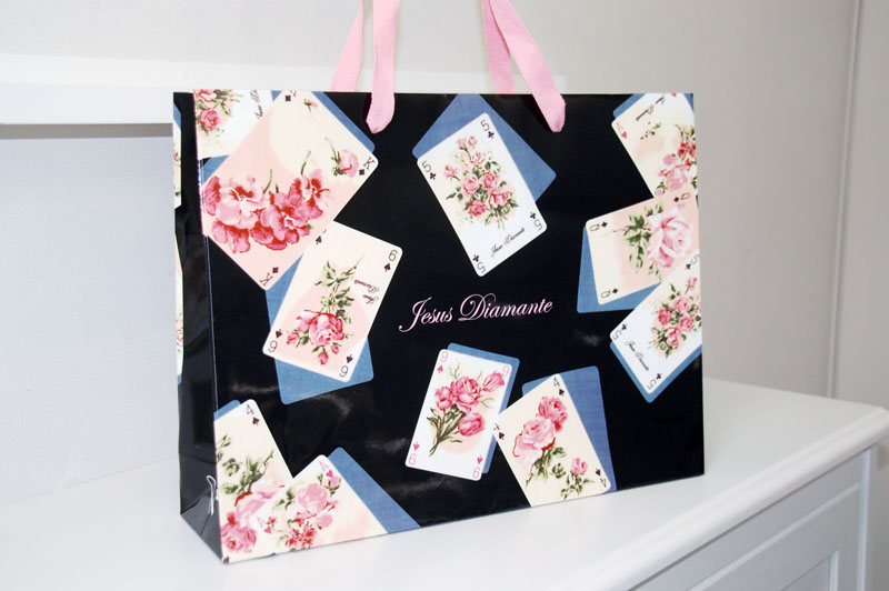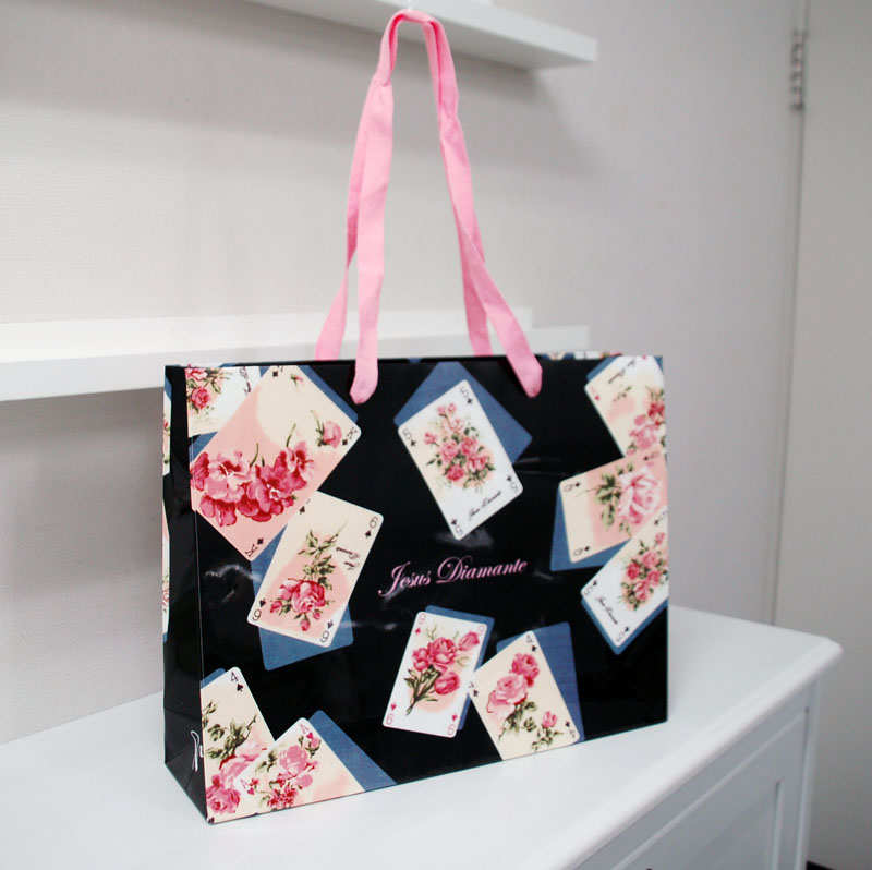 かわいいトランプ柄が印刷されたオリジナル紙袋2011年10月03日 こんにちはベリービーの芦谷です。 私の好きなデザインノ一つに 「トランプ」柄があります。 なんだか、トランプの模様の クラシカルでミステリアスな感じが大好きです。 そんなトランプ柄を大胆にあしらった紙袋をご紹介します。 おちついた深い紺色のバックに とてもカラフルな花模様のトランプが散りばめられています。 表面の加工はグロスPP貼りです。 サイドにはアニバーサリーの文字が印刷されています。 インパクトのあるデザインながら フェミニンなイメージが素敵な紙袋ですね。
