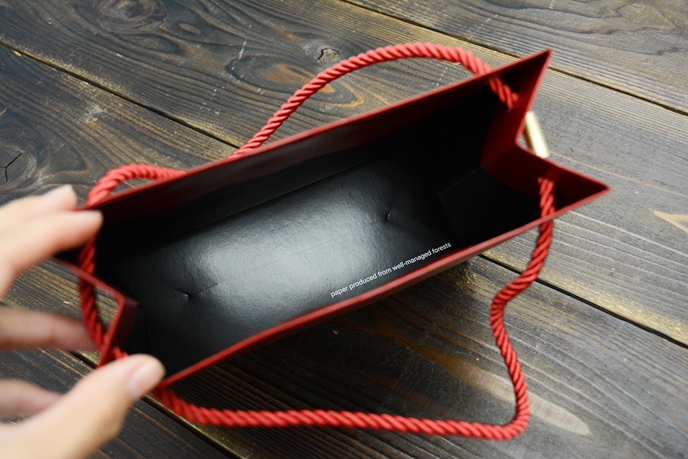 ハンドルもワインレッドで、高級紙袋の定番「ツイストロープ」です。