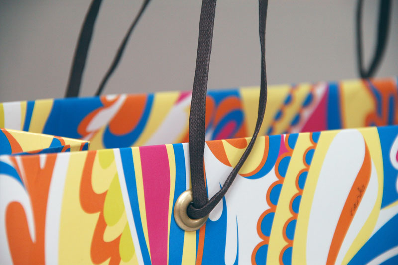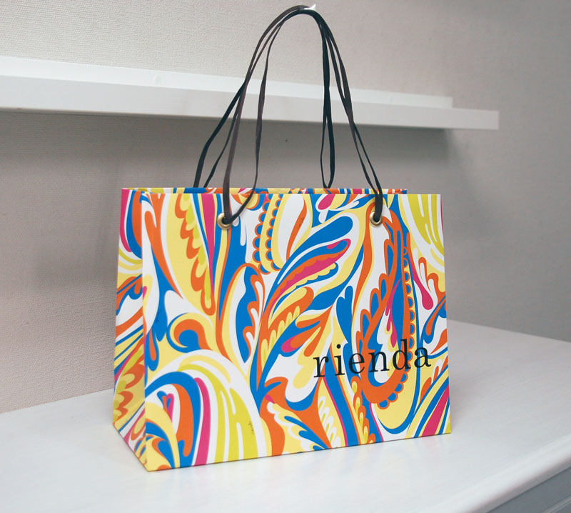とってもカラフルな紙袋の印刷2011年10月17日 こんにちはベリービーの芦谷です。 今日はとてもカラフルな印刷をした紙袋をご紹介します。 4色プロセスカラーでとっても美しいデザインがされています。 そして、この紙袋のハトメと手提げ紐が特徴的です。 少し、膨らみのあるかわいいハトメに 革紐のようなイメージの蝋引きされた紐が使われています。 ロゴマークは浮きだしエンボス。 内側は眩いピンクベタ。 底ボールにまでベタ印刷がされています。 女性向けブランドの紙袋は いつみても単純に物を入れる道具ではなく ロマンを感じさせますね。