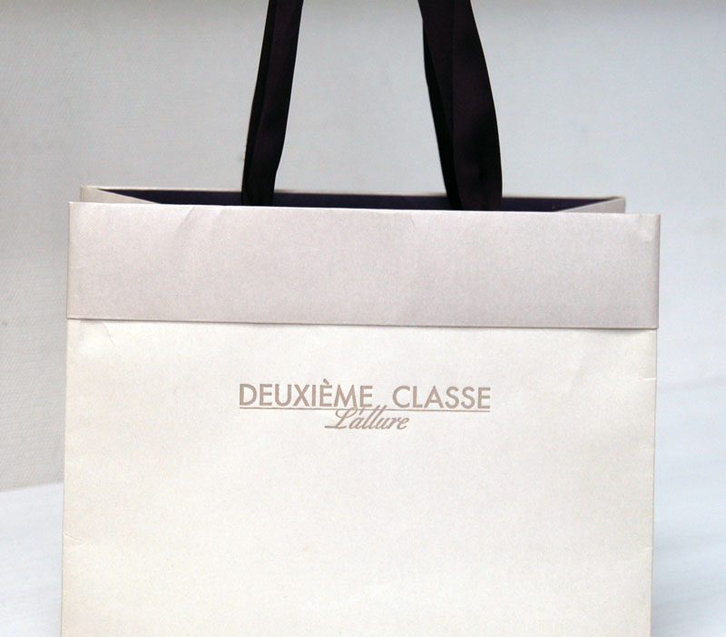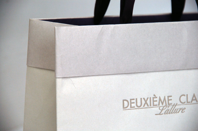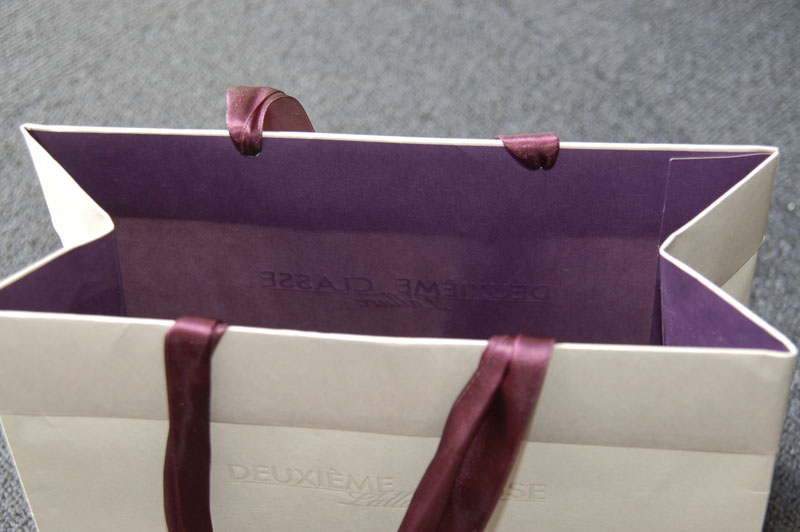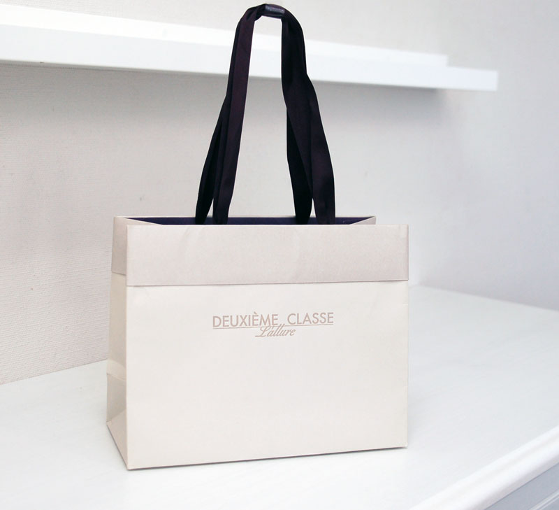 すごくお気に入りの紙袋2011年10月18日 こんにちはベリービーの芦谷です。 今日は私がとても気に入っているデザインの紙袋をご紹介します。 とってもシンプルなデザインですが 大人の魅力を感じさせます。 全体的に落ち着いたグレー。その中に少し深い目のグレー箔押しがいいですね。 グレーに合わせた深い紫色のリボンとのコントラストも絶妙。 口折りを表側にしている所なんかもキュートです。 内側にはリボンに合わせた深い紫色が底ボールまで印刷されています。 この紙袋は私の宝物の一つです。