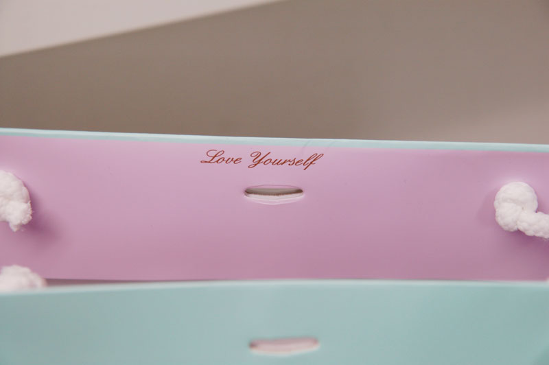 品と格を感じさせるオリジナル紙袋2011年11月10日 こんにちはベリービーの芦谷です。 今日はとっても上品で高級感のある紙袋をご紹介します。 美しく落ち着いたターコイズブルーに ブロンズ色のフレームが印刷され、その中に気品のあるロゴマークが配置されています。 口には薄いパープルのかわいらしいリボンが付けられています。 口折りに書かれた「Love yourself」という文字も素敵です。