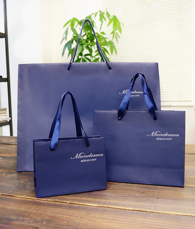 3種類のサイズ展開で作られたネイビーで統一されたとても綺麗な紙袋です。