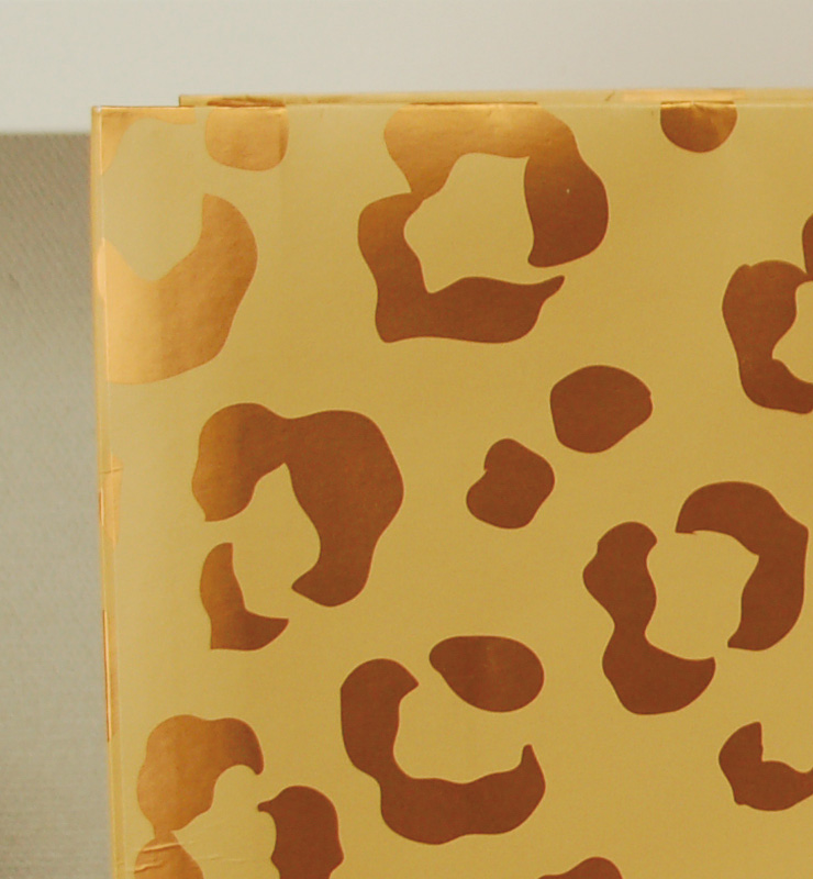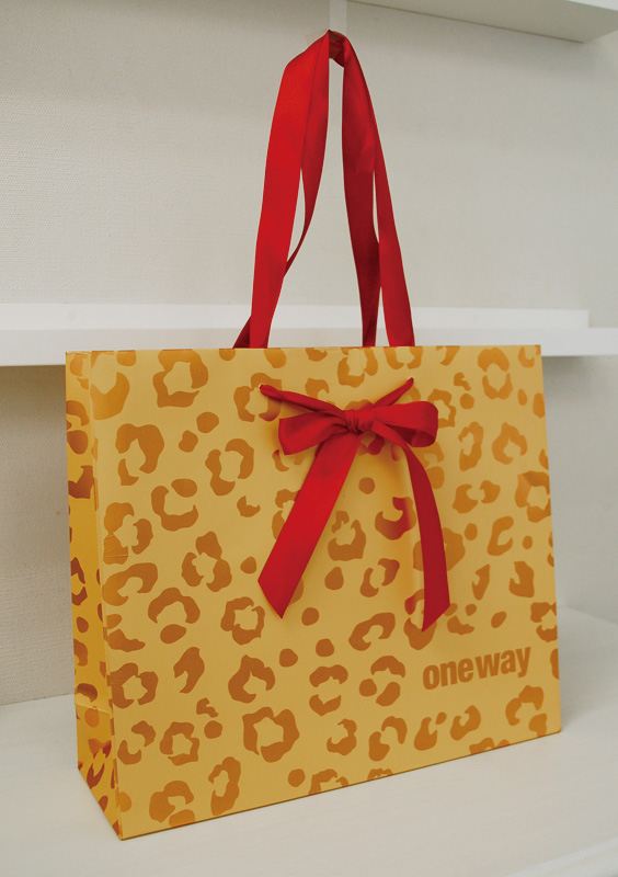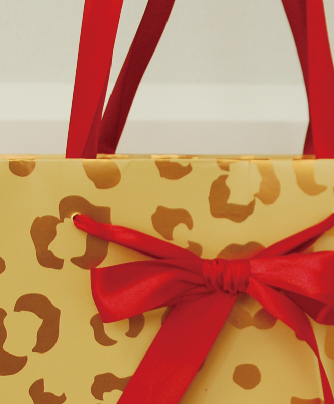人気のレオパード柄オリジナル紙袋2012年01月06日 こんにちは!! 今日は女性に大流行のレオパード柄の オリジナル紙袋をご紹介します。 パンチのあるゴールド×レッドです! サテンリボンのハンドルです。 前面で結んだリボンがアクセントになっていますね。 こちらも流行の手法です。 ボディはゴールドにつや消しゴールドを印刷しています。 女性に人気のデザインや仕様を ふんだんに使ったオリジナル紙袋ですね!