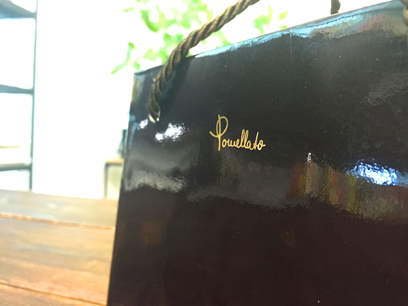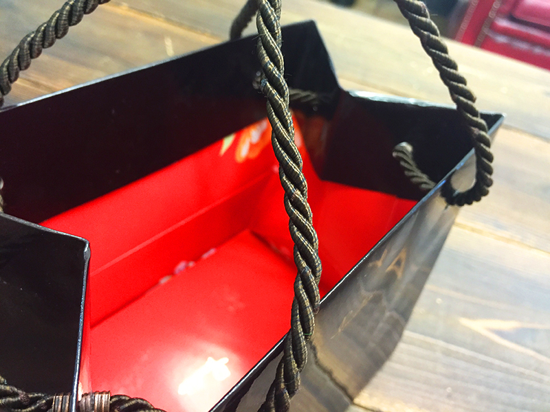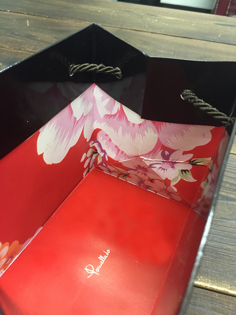 外から見たのシックな雰囲気からはわからない、内側の華やかさと箔押に驚くゴージャスな紙袋でした。