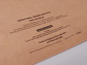 ステーショナリーのようなオリジナル紙袋2012年01月14日 こんにちは! 今日は、ステーショナリーのような オリジナル紙袋のご紹介です。 A3が入るくらいの大きさです。 裏面はこちら。 ステーショナリーみたいでかっこいいですね! ハトメがかわいいですね。 クラフト紙にブラックで印刷。 中面は光沢のあるホワイトです。 このパッケージはおそらく ネット通販で買い物したときに使われているようです。 今までは、かわいい紙袋が手に入るのは 実店舗で買い物したときの特権だったのですが 最近はネット通販でも素敵なパッケージで届くのですね! 恐るべし、ネット…。