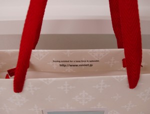 写真を貼ったようなオリジナル紙袋2012年01月28日 こんにちは! 今日のオリジナル紙袋はコチラです! ハンドルは平紐。 口折りにはURLが印刷されています。 写真を貼っている…ように見えますが、 普通の4色印刷。 PP加工なしボディに 写真部分だけ光沢のある加工をしているので 本当に写真を貼付けているように見えます。 (微妙な光沢なのでわかりづらいです。。) 側面はこんな感じ。 どちらのブランドも引き立てる、 素敵なコラボ紙袋ですね。