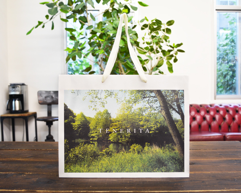 白い紙袋に、豊かな緑に包まれて癒されるイメージが印刷されています。