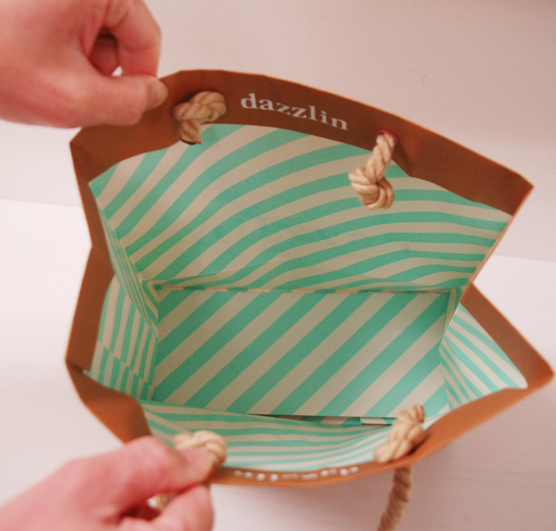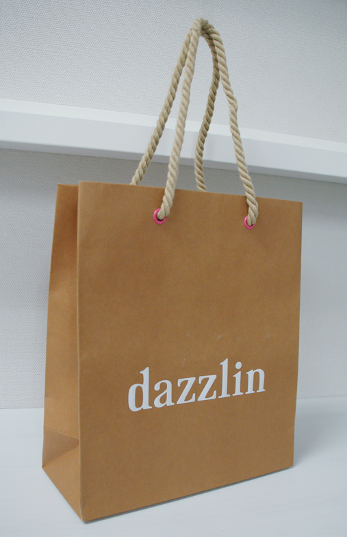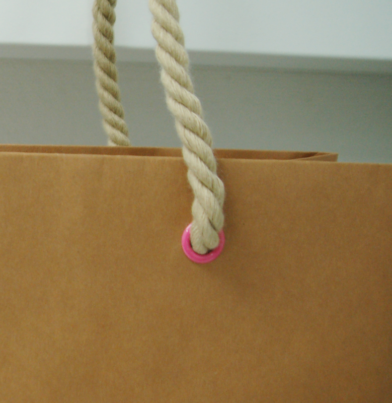 かわいいカラーリングのオリジナル紙袋2012年01月30日 こんにちは! 今日の紙袋のご紹介です。 一見シンプルなデザインです。 白箔押しでロゴを印刷。 かわいいピンクのハトメ! ハンドルは太めのツイストロープ。 そして内側にはグリーンのストライプです! かわいい! 素材の使い方や、カラーリングにセンスを感じる、 素敵なオリジナル紙袋ですね。