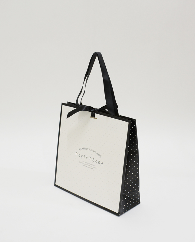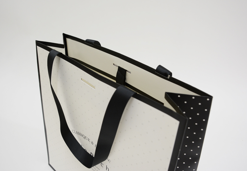 紙袋の表面・裏面はグレーの細かいドットが、側面(マチ)は黒地に白の細かいドットが