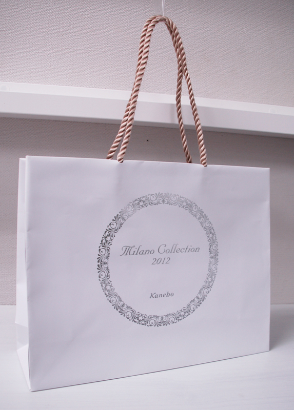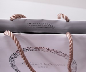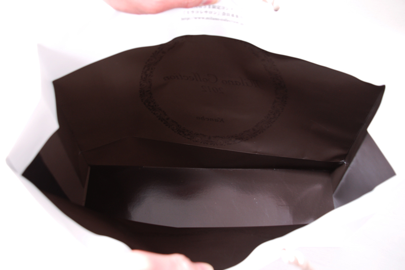 シンプルでゴールドの上品なオリジナル紙袋2012年02月07日 こんにちは。 今日のオリジナル紙袋の ご紹介です。 ハンドルはシャンパンゴールドの ツイストロープです。 デザインを損なわないように縦穴式で 取付けられています。 シルバーの箔押し 内側はブラックの1C刷り。 一見シンプルですが ツイストロープや内側をブラックにしているあたりが こだわりを感じるオリジナル紙袋ですね。