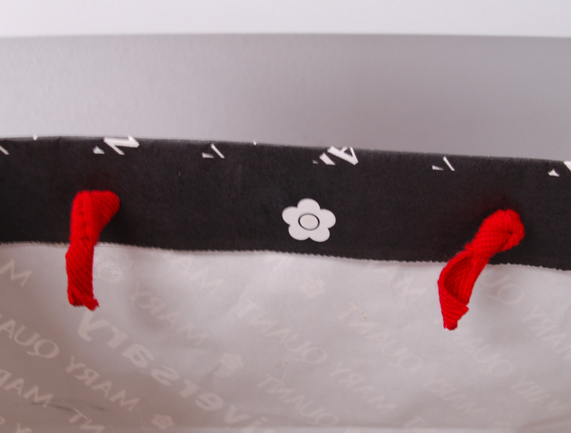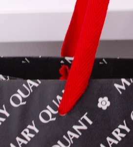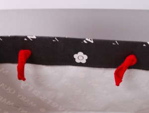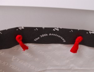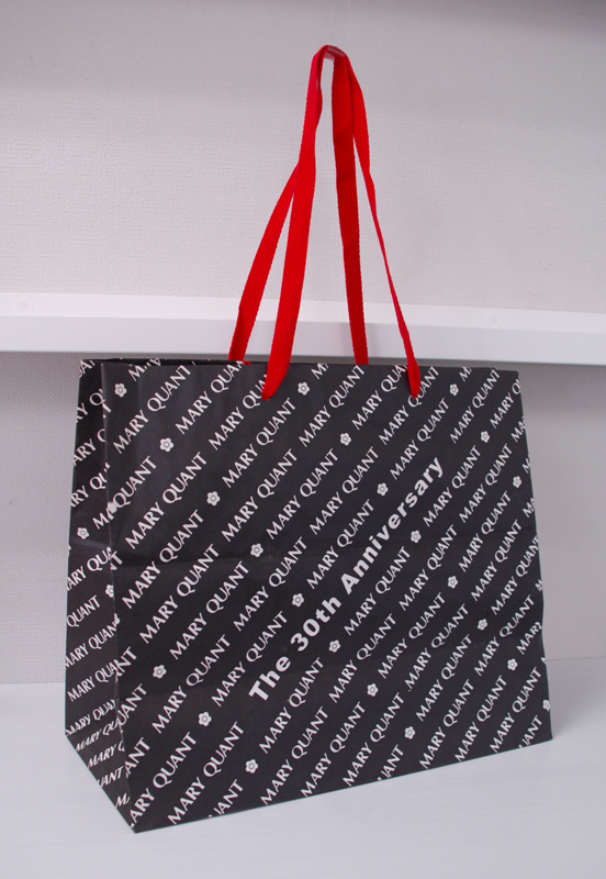 期間限定のオリジナル紙袋2012年02月12日 こんにちは!根来です。 インフルエンザが流行っていますね。 みなさんお気をつけください! 今日は30周年の限定紙袋を ご紹介します。 赤、白、黒のカラーリングがかっこいいですね。 ハンドルは平紐です。 ロゴパターンにまぎれて30周年アピール。 ニス引きのみでPP加工はされていません。 口折り部分にロゴと30周年。 よく周年記念で紙袋を新調する ご依頼をいただきます。 マンネリ化防止にお役立ちですね!