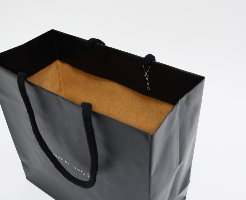 黒一色の紙袋に、手書きのような文字のロゴが、白の箔押しでさりげなく入っています。