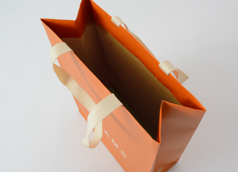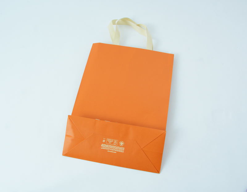 使っている色はブランドカラーのオレンジと、ロゴ・ハンドルの生成り色とシンプルな色構成の紙袋です。