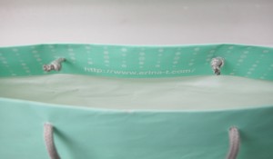 きれいなグリーンのオリジナル紙袋2012年02月13日 こんばんは!根来です。 今日のオリジナル紙袋はコチラ! グリーンがきれいですね。 それだけで目にとまります。 ハンドルはグレーのアクリルスピンドルです。 口折りにはかわいいドットとURLです。 ロゴはレインボーの箔押しです。 ボディはニス引きです。 今女性に人気のカラーですね!! 口折り部分にデザインのある紙袋も イマっぽいですね! 紙袋作りの参考にどうぞ!!
