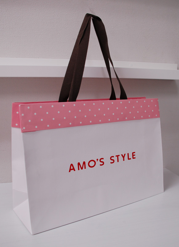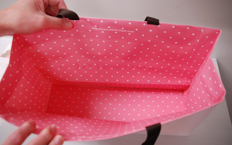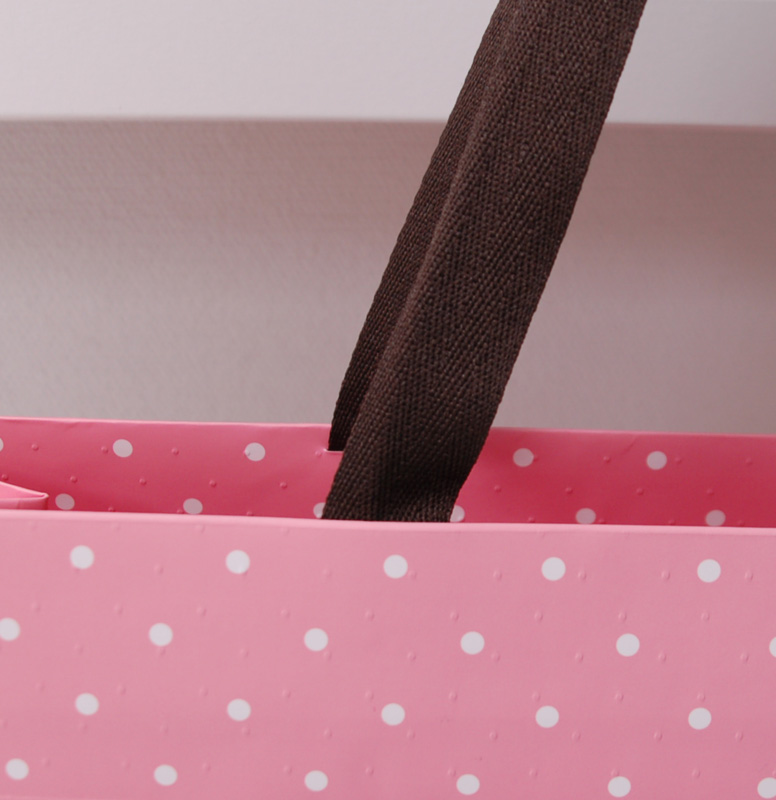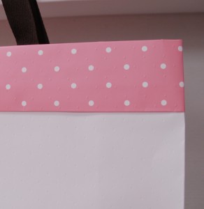 いちごケーキのようなオリジナル紙袋2012年02月17日 こんにちは!根来です! 今日もさっむいですねー 本日のオリジナル紙袋はコチラ! ハンドルは薄めの平紐。 紙全体に小さいドットの エンボスがかかっています。 いちご感アップです! 口の部分は折り返しです。 内側もピンクのドットがラブリーです。 口折りにはURL。 エンボスを使用すると 紙袋のイメージがぐっとアップしますね! とってもかわいいオリジナル紙袋です。