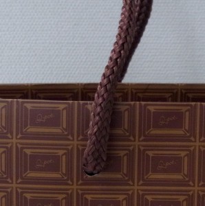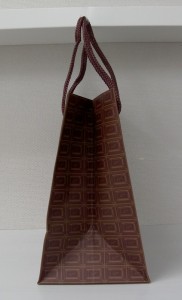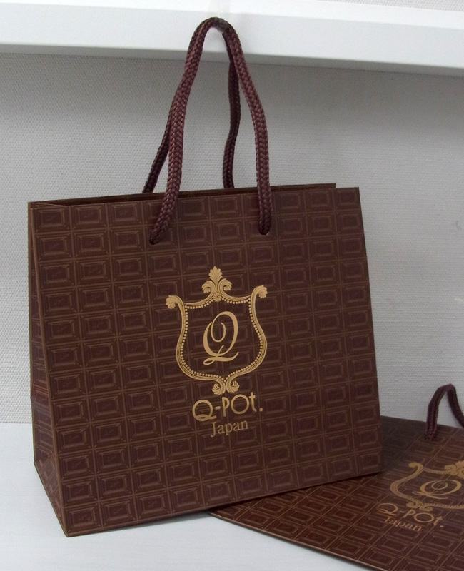 チョコレートのようなオリジナル紙袋2012年02月22日 こんにちは!根来です。 今日はチョコレートのような オリジナル紙袋をご紹介します。 側面にもぎっしりチョコレート。 太めのハンドルが印象的です。 ロゴはゴールドの箔押しです。 商品である、バッグやポーチと 同じデザインで作られたオリジナル紙袋です。 ショップバッグはもはや 「ただモノを入れる袋」ではなく、 プロモーションのツールとしての役割があります。 紙袋ひとつでも企業姿勢や その商品への思い入れも感じることができます。 紙袋作りもあなどれませんね!