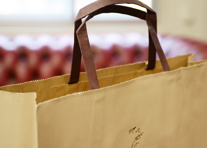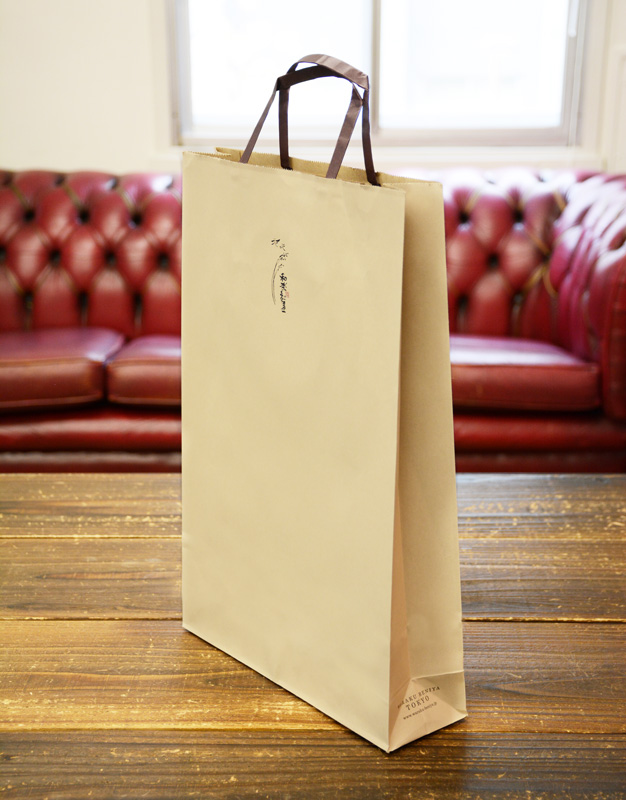 薄くて渋い茶色のシンプルな紙袋です。ハンドルは濃いめの茶色で、落ち着いた雰囲気。