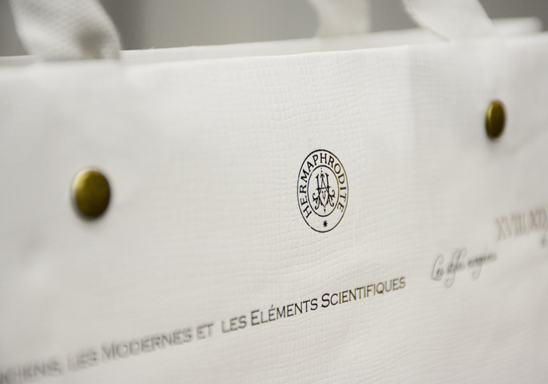 ロゴは紙袋の上のほうにだけ小さめに入っていて、黒い箔押しと金色の印刷が組み合わされています。