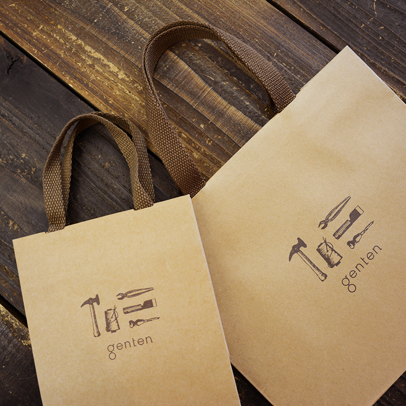 トートバッグのような形の紙袋が最近の流行り。縦留めにすることでその形になっていますね。