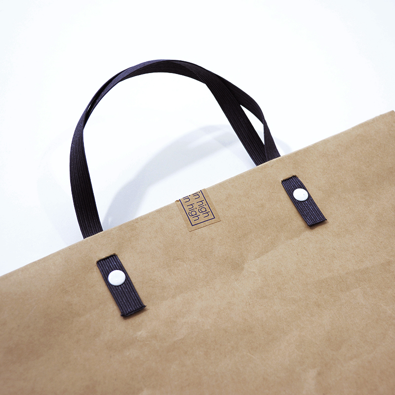 紙バンドのハンドルは少し珍しい形で、金具で縦留めされています。ハンドルの先が紙袋の表面に出ているデザインもあまり見かけないので、目を引きます。白のボタンがぽちっとしていて可愛いですね。