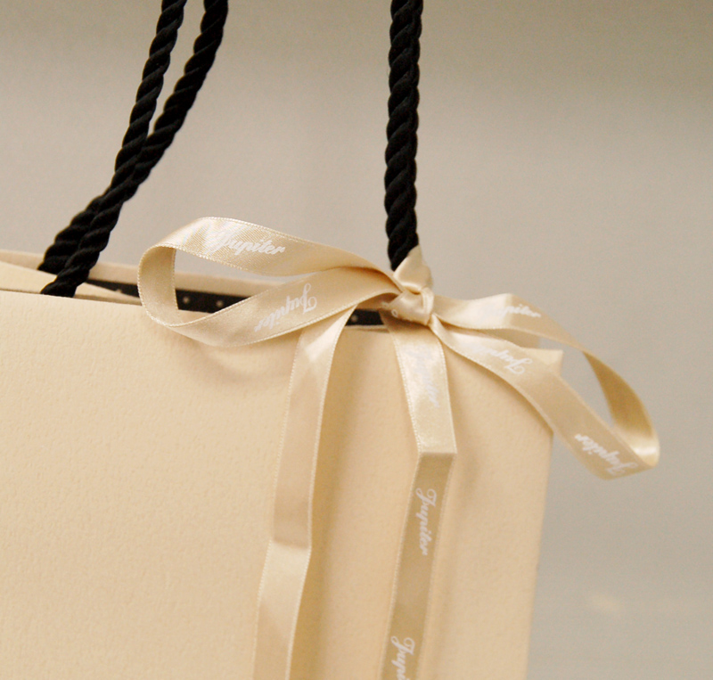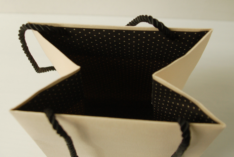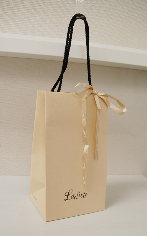 上品でしなやかなオリジナル紙袋2012年03月18日 こんにちは、根来です。 今日の紙袋はこちらです。 かわいい!! ヌーディーなカラーリングが イマっぽいですね。 ハンドルは細めのツイストロープ。 リボンつきです。 ボディは紙の風合いを生かすため PP加工はされていません。 内側は細かいドット柄。 かわいい! さらに!サンキューカードつきです。 ハンドルや紙質へのこだわりが 上品で魅力的な紙袋を作り出すのですね。 お気に入りの紙袋です。