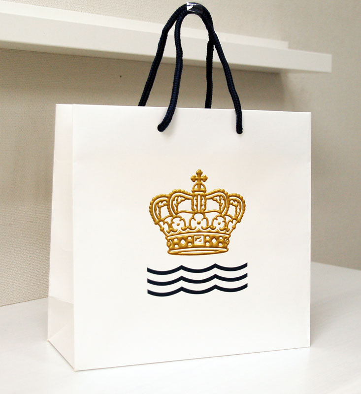 高級感たっぷりの「クラウン」が素敵な紙袋2012年03月24日 こんにちはベリービーの芦谷です。 今日は高級感たっぷりの 「クラウン」が浮き出し箔押しされた紙袋をご紹介します。 センターにどーんと大きく浮きだし箔のクラウンがプリントされています。 質感がしっかり出ていて存在感のあるクラウンに圧倒されます。 反対面にも小さなクラウンが箔押しされています。 こちらはとっても上品な感じ。 紐はパイレンロープです。 クラウンってとっても高級感を物に持たせるって事を あらためて実感させられました。