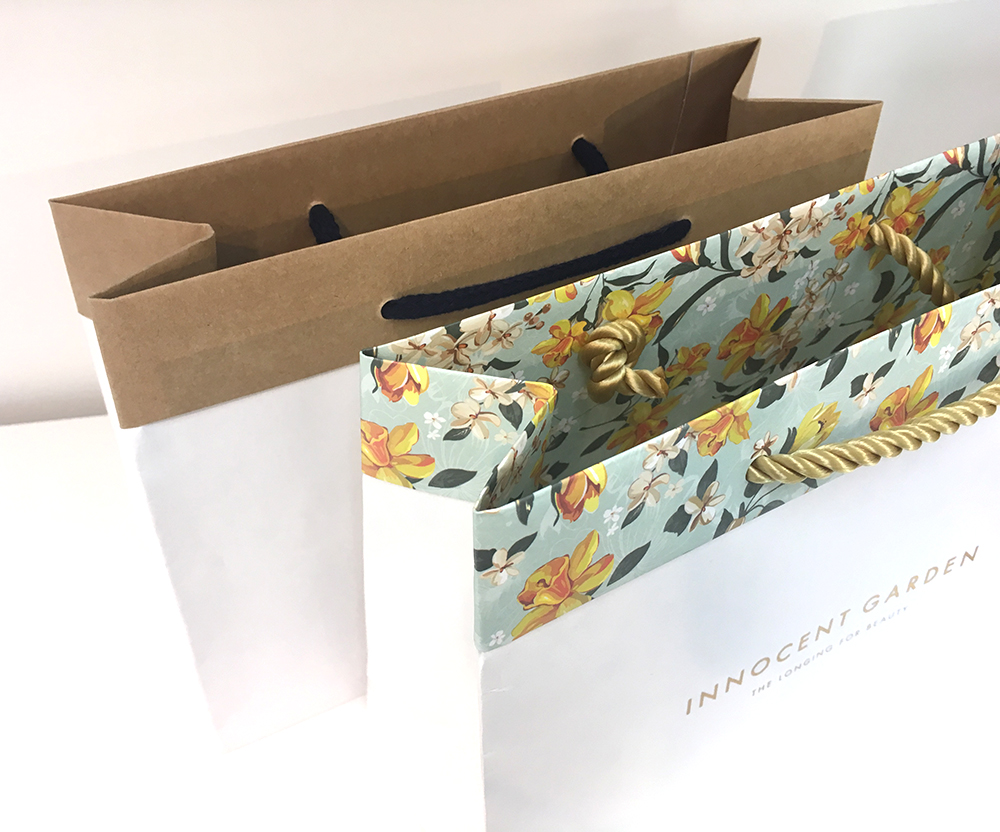 全体的にナチュラルな質感ですが、ロゴや薔薇モチーフ&内側への折込みで、ナチュラルながらも上品さのある紙袋になっているんですね。技ありです。