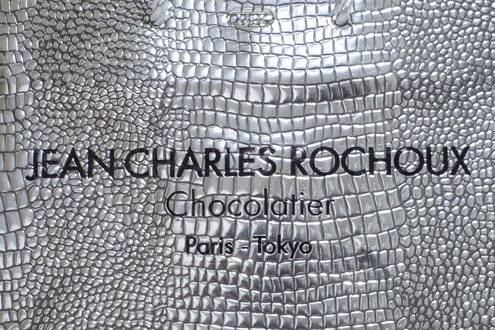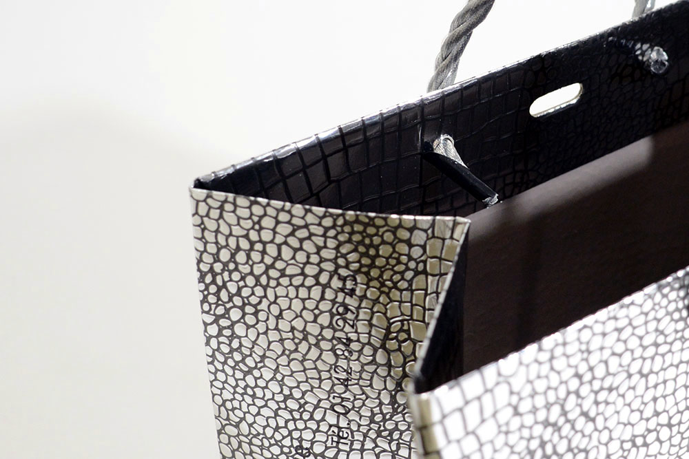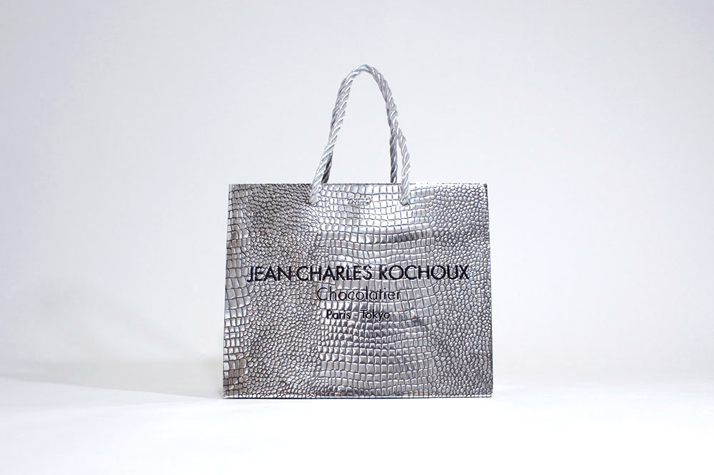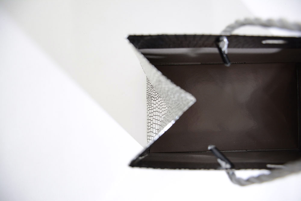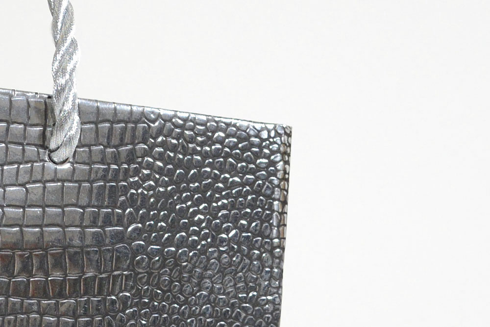 ご覧のようにピカピカのクロコ型押し画前面に施された紙袋です。