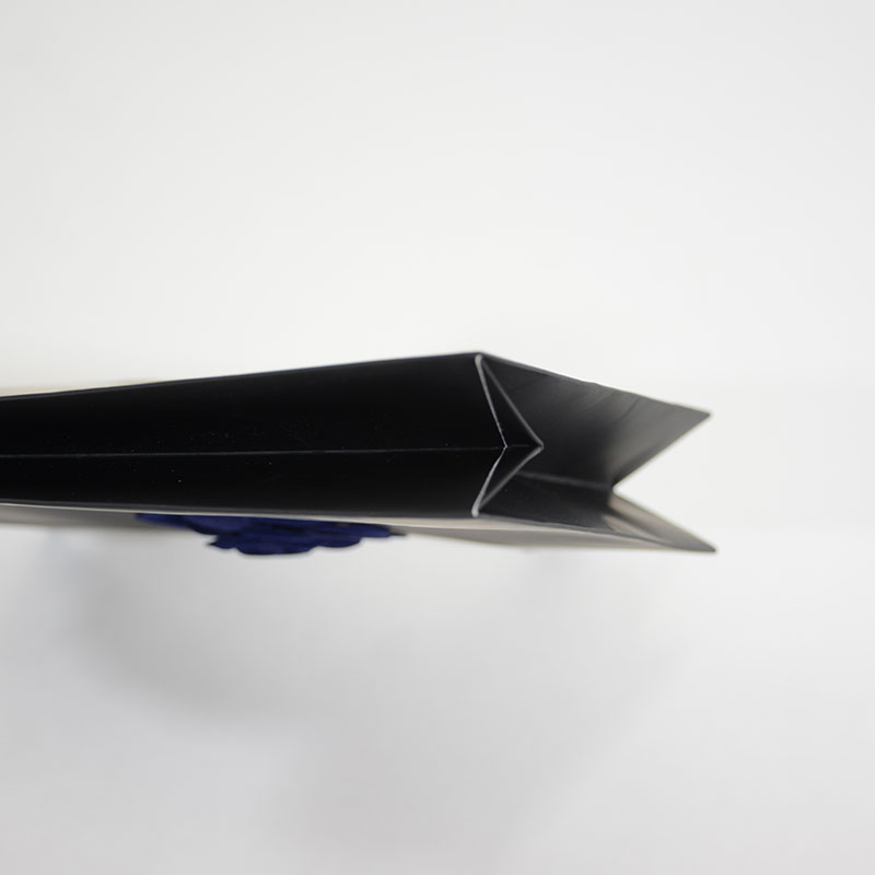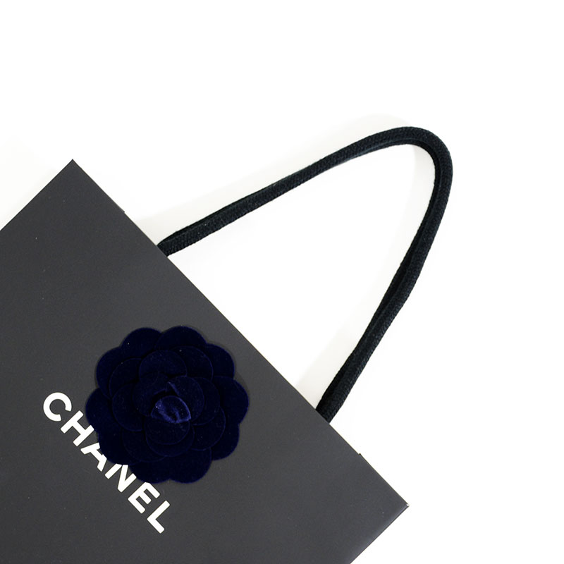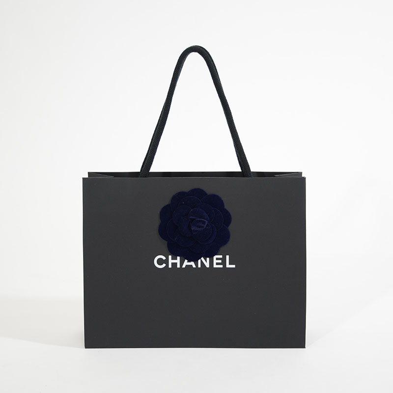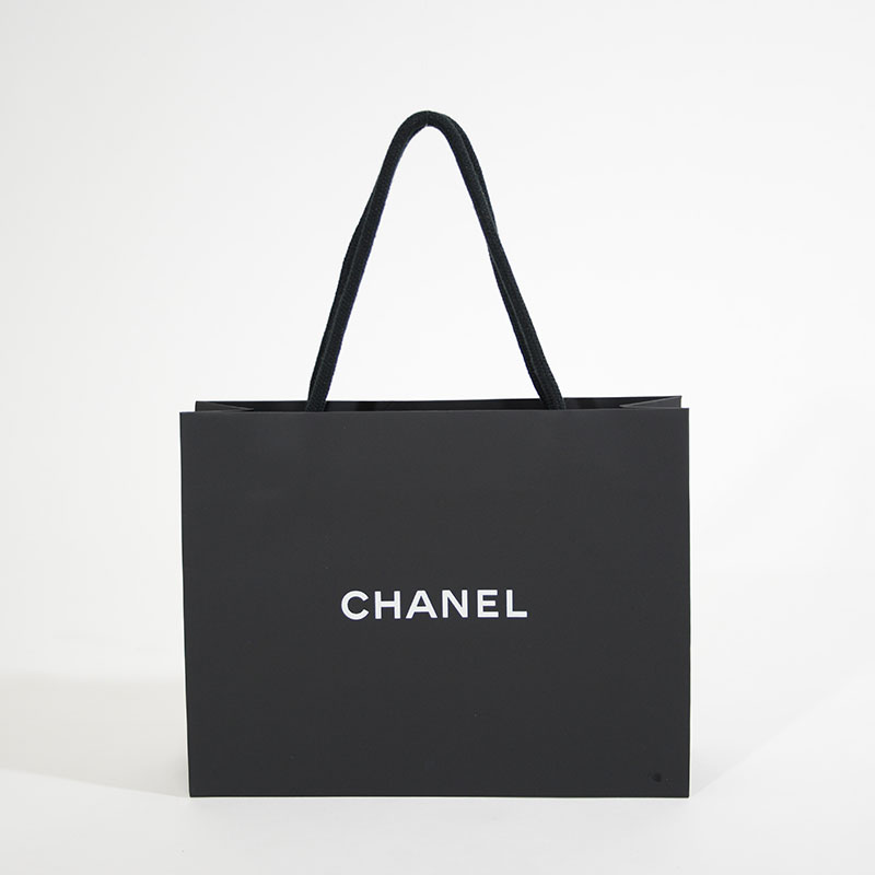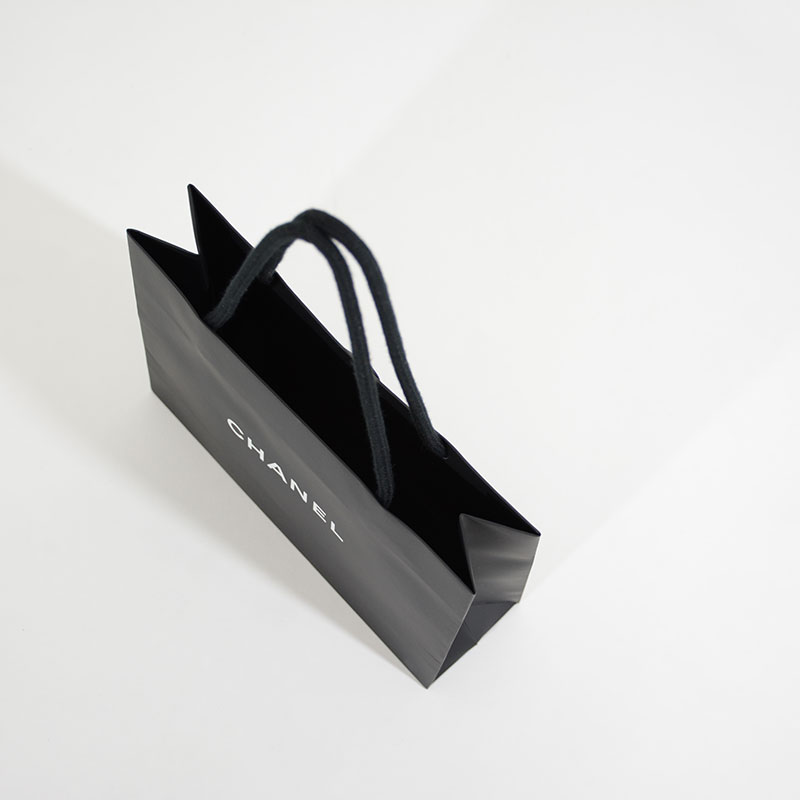紙質・ベロア・マットなブラックボディ、白色のロゴと大人の高級感を漂わせた紙袋となっています。