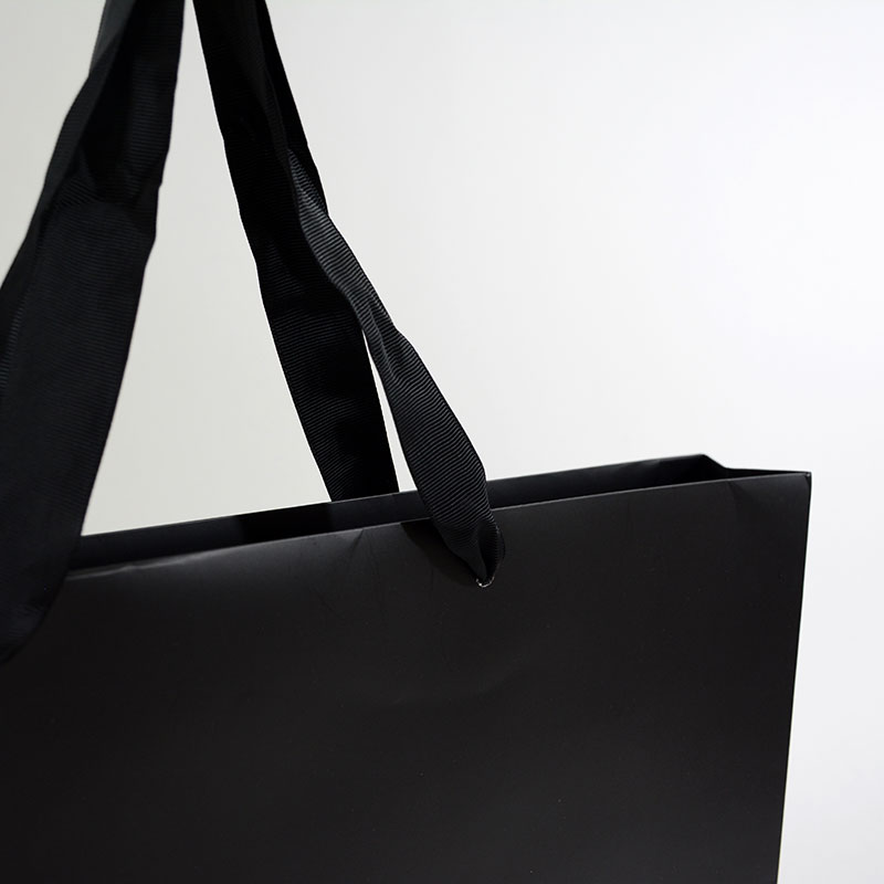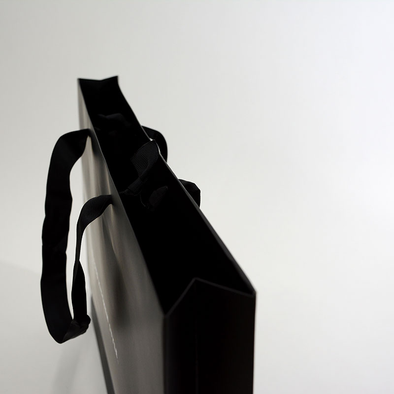 黒色のマットな質感の紙袋にホワイト箔でロゴが印刷されています。