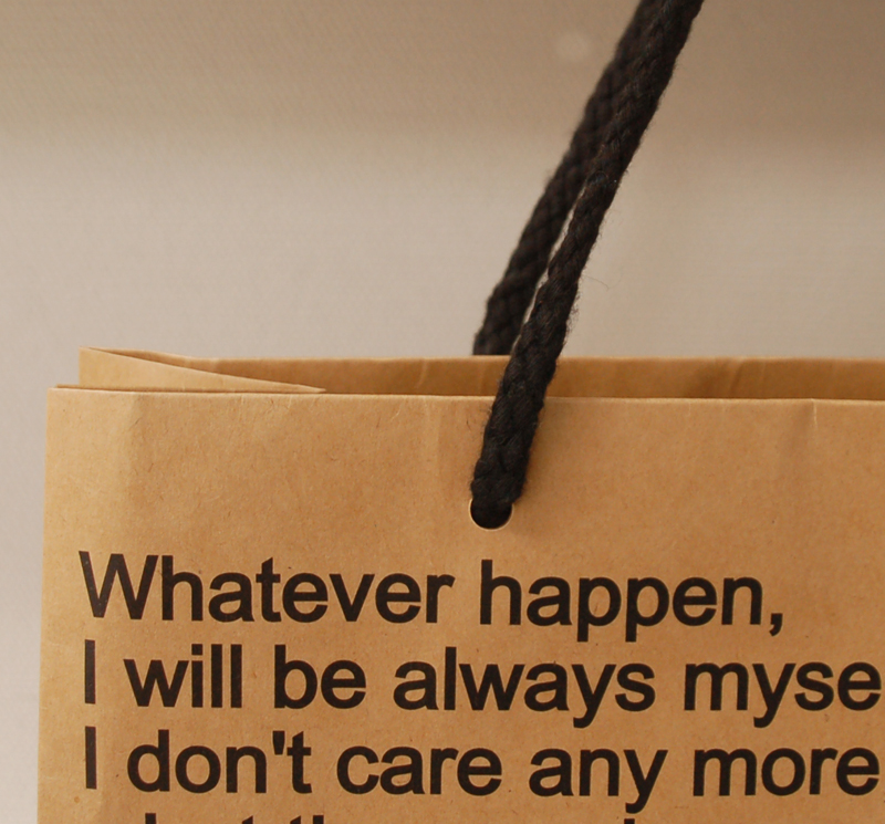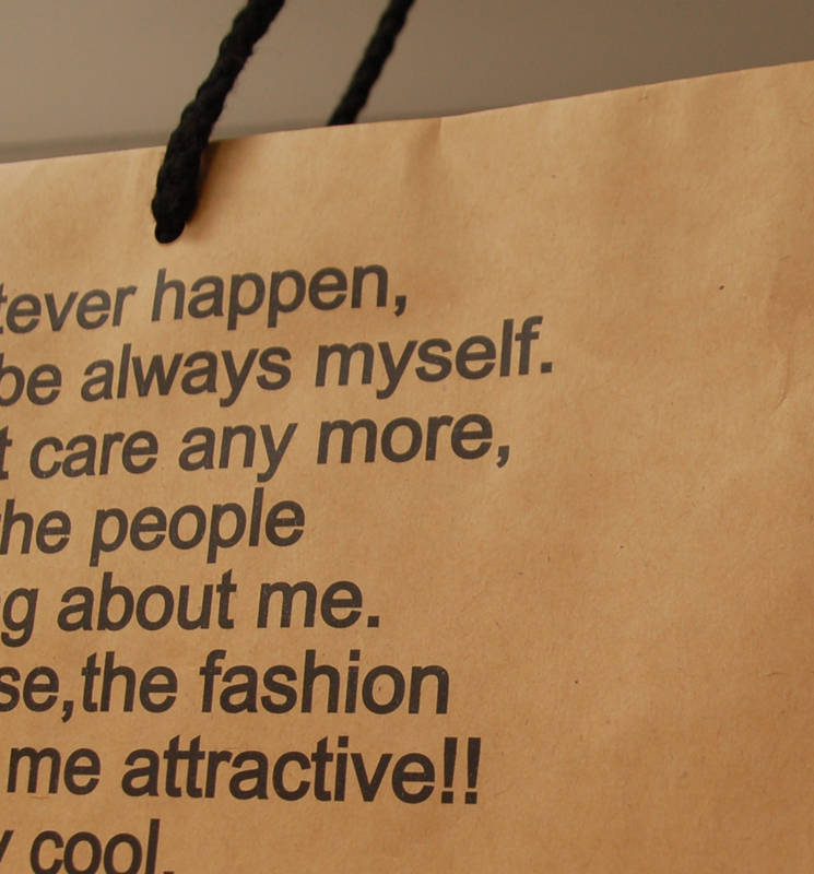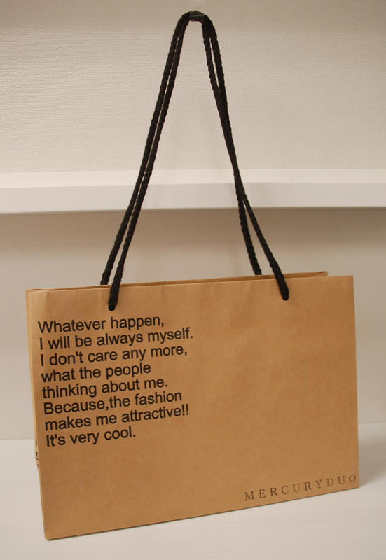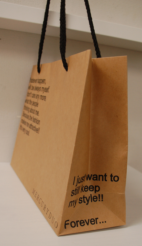 ナチュラルなオリジナル紙袋2012年04月05日 こんにちは、ベリービーの根来です。 今日はナチュラルでかっこいい オリジナル紙袋のご紹介です。 ハンドルはアクリルスピンドル。 クラフト紙にマットPP。 クラフト紙はPP加工せずに原紙で 使われることが多いのですが 流行のロウ引きのような印象です。 側面のデザインはこんな感じ。 紐穴間を広めにとっているところと タイポのバランスが とってもかっこいいオリジナル紙袋ですね!!
