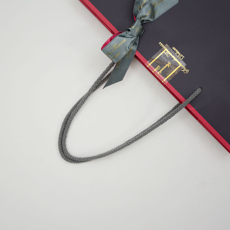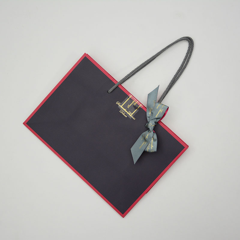 この紙袋はラグジュアリーラインの紙袋となっておりリボンや紐の色を落ち着いたグレーにすることで可愛さや甘さが出る部分をあえてシックに抑えることでラグジュアリーな雰囲気を表現しています。