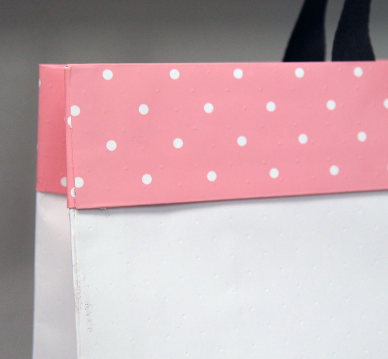 ピンクの口折りとさわやかなホワイトにピンクのロゴのバランスがかわいい紙袋です。